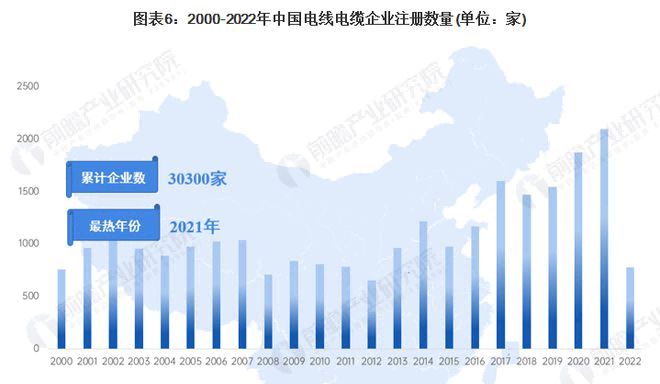我國電線(xiàn)電纜行業(yè)的企業(yè)數量眾多,其中以中小企業(yè)居多。根據中國企業(yè)數據庫企查貓,截至2022年12月27日,中國電線(xiàn)電纜行業(yè)的主要企業(yè)共有30300家,其中以2021年為主要注冊熱潮,當年注冊企業(yè)數量為2095家,而2022年則為778家。
