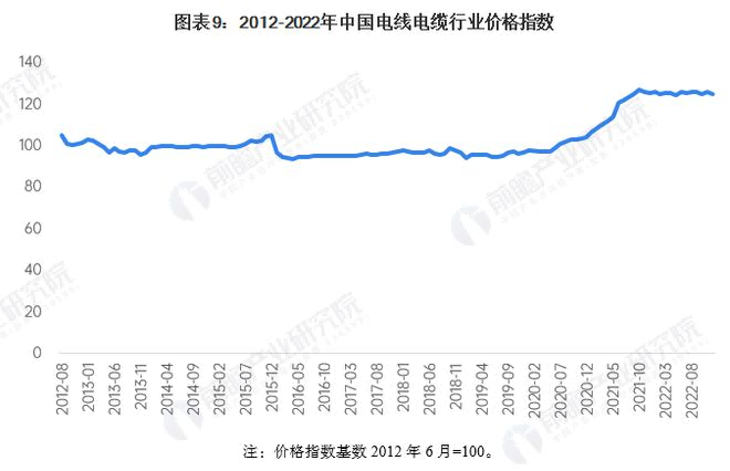 近年來(lái),我國普通電力電纜、光電線(xiàn)纜、通用裝備線(xiàn)纜企業(yè)數量較多,產(chǎn)能已經(jīng)過(guò)剩,市場(chǎng)陷入以?xún)r(jià)格競爭為主的低水平惡性競爭,行業(yè)的價(jià)格水平自2016年起持續下滑。中國五金機電價(jià)格指數顯示,電線(xiàn)電纜行業(yè)價(jià)格指數長(cháng)期以來(lái)低于100,產(chǎn)品技術(shù)含量低、同質(zhì)化問(wèn)題嚴重是導致行業(yè)價(jià)格持續低迷的主要原因。但是隨著(zhù)疫情影響減弱,市場(chǎng)投資熱情漸起,加之政策的引導,自2020年11月開(kāi)始,價(jià)格指數有了明顯的回升。截至2022年12月,我國電線(xiàn)電纜行業(yè)價(jià)格指數為124.65,已經(jīng)遠高于前期高點(diǎn)。