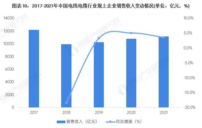 根據國家統計局的數據,由于近年來(lái)我國宏觀(guān)經(jīng)濟疲軟和制造業(yè)去產(chǎn)能的影響,電線(xiàn)電纜行業(yè)一度出現規模下滑,并在2018年達到低谷,達到0.99萬(wàn)億元。隨著(zhù)我國對新能源等投資的加快,電線(xiàn)電纜行業(yè)開(kāi)始緩慢復蘇。2021年中國電線(xiàn)電纜行業(yè)規上企業(yè)銷(xiāo)售收入達1.12萬(wàn)億元,同比增長(cháng)3.6%。